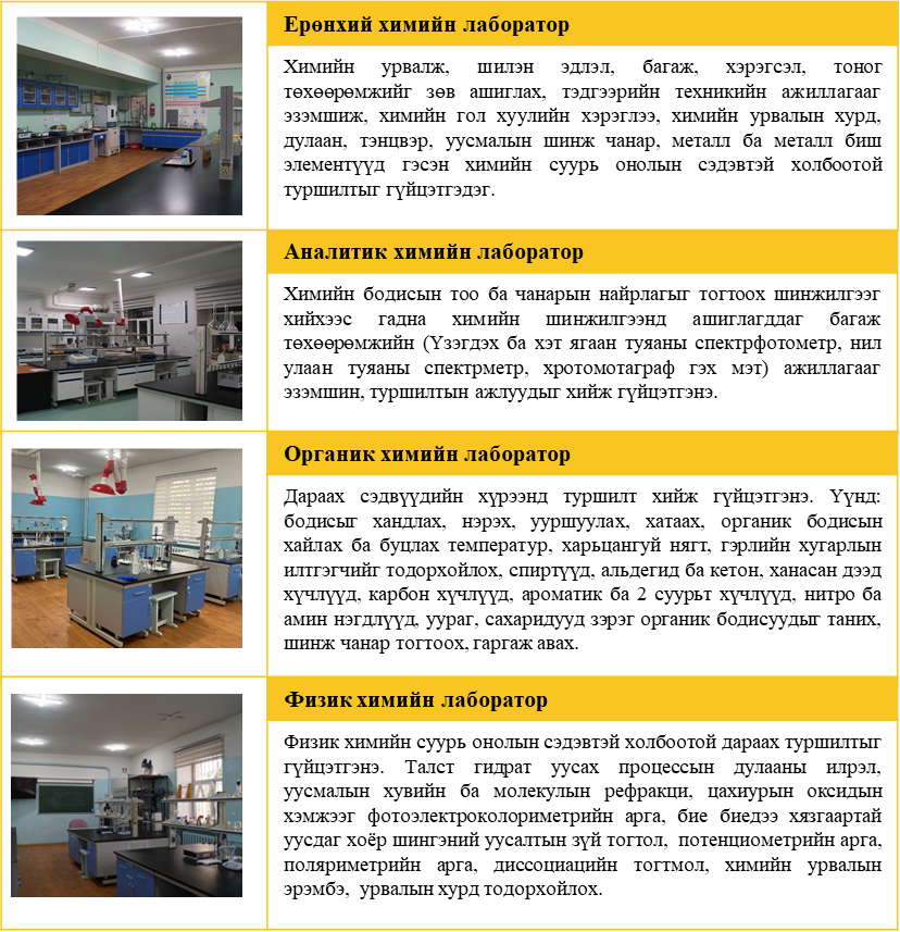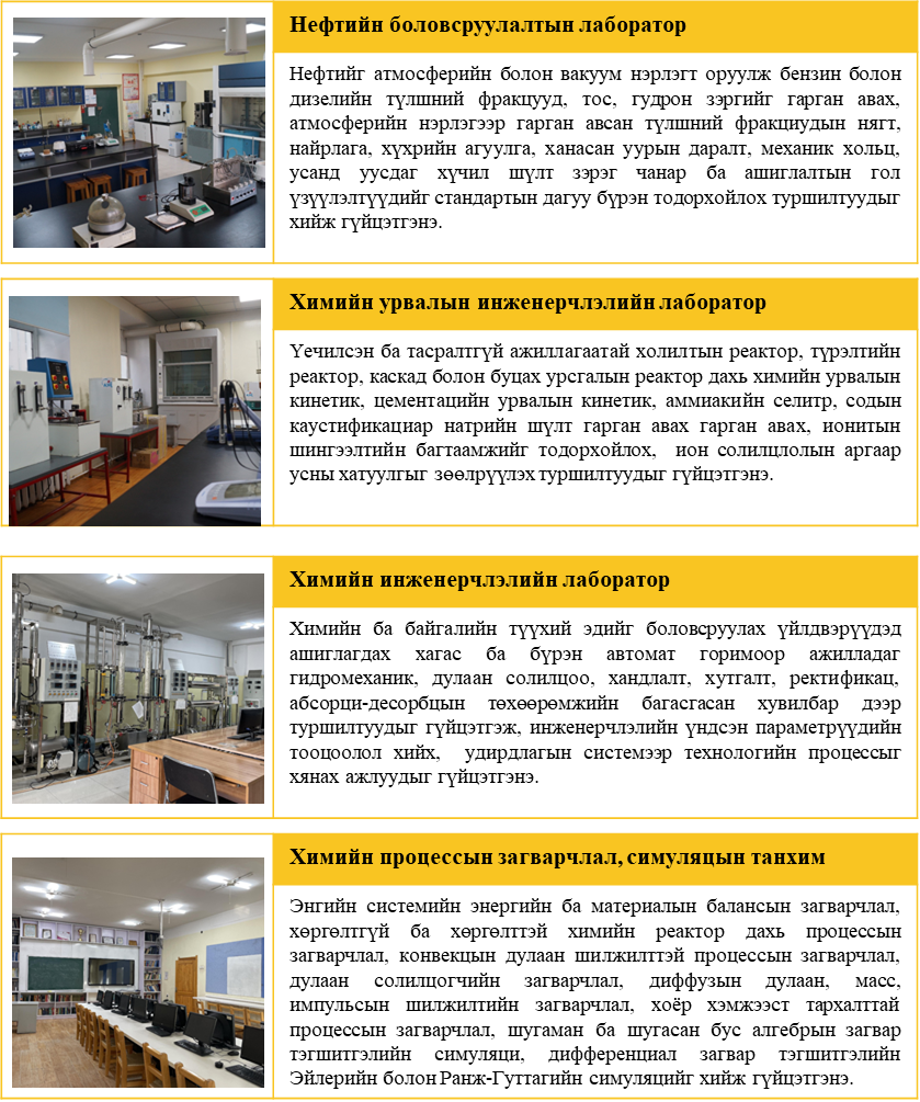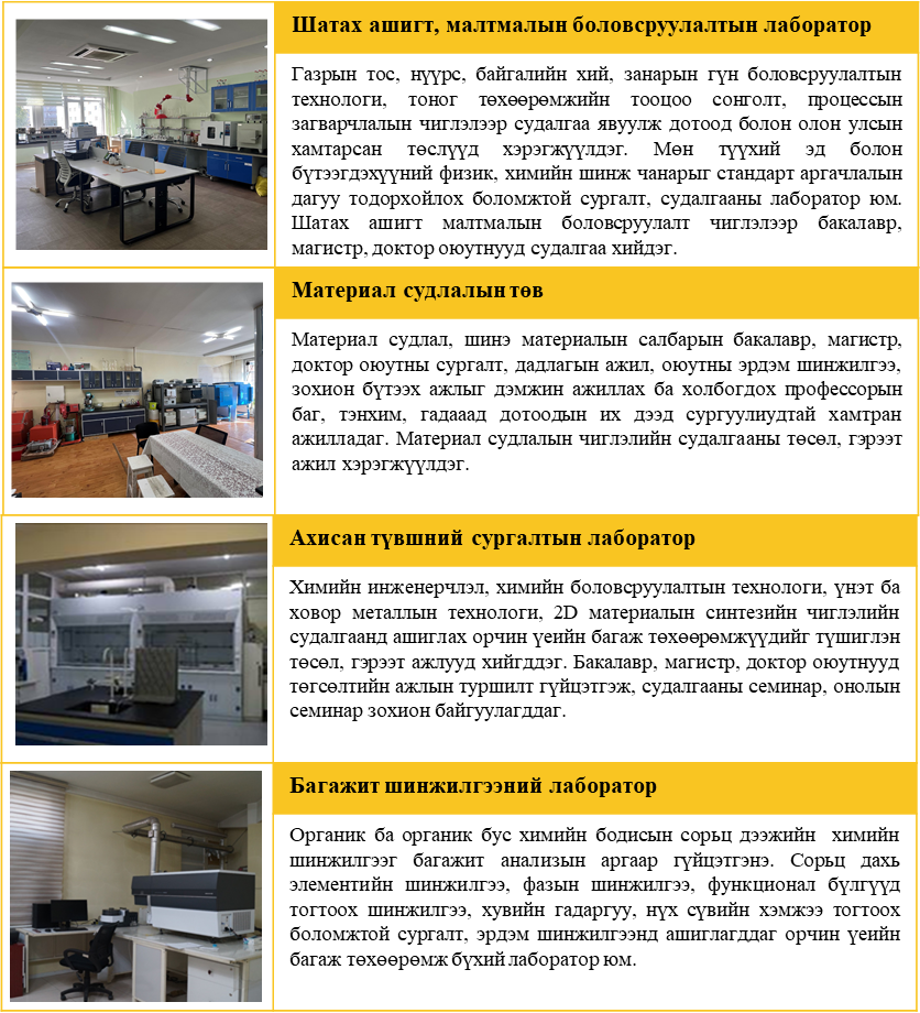 Химийн инженерчлэлийн тэнхим нь лекц семинарын 2 танхим, сургалтын 7, судалгааны 5 нийт 12 лаборатор, судалгааны 1 төвтэй. Сургалтын лабораторуудад ерөнхий эрдмийн болон мэргэжлийн суурь, мэргэшүүлэх хичээлүүдийн туршилтын ажлууд хийгдэх ба судалгааны лабораторуудад төгсөх ангийн оюутны судалгааны ажил, төсөл, гэрээт ажлууд гүйцэтгэдэг.